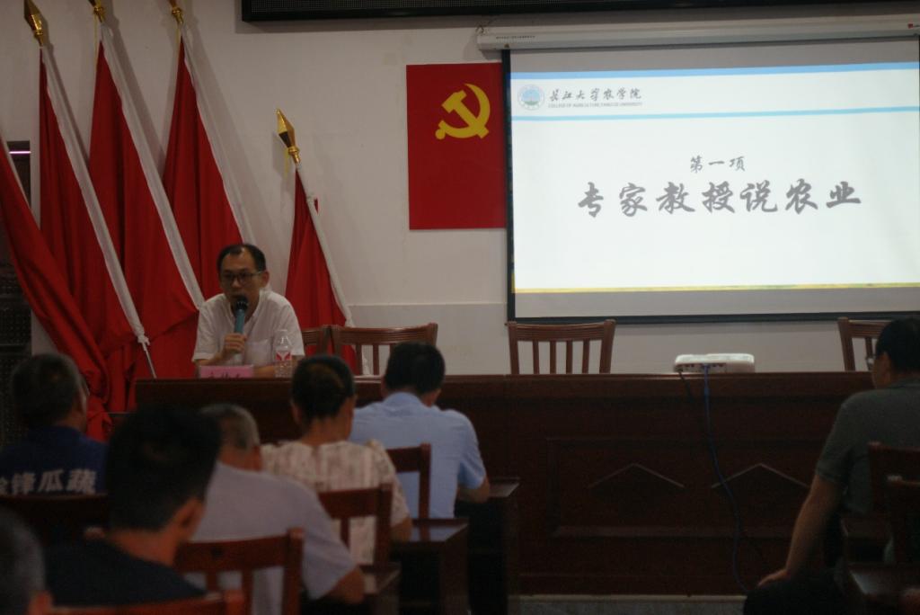 (通讯员 刘钬桥 王静茹 梁传蔚)为深入贯彻“情满三农 惠民先锋”精神,7月12日下午,永利3044集团官网暑期“三下乡”社会实践队邀请本院植物保护领域专家马东方及徐志红两位教授,在石首市大垸镇黄金湾村村委员会举行“兴农梦想班”活动,活动包含教授说农业和种子画展览活动。本次活动由石首市农业技术培训学校副董事长甘立新主持,石首市农业培训学校董事长郑先凯,石首市农业农村局蔬菜办副主任李松发出席,华中农业大学暑期“三下乡”社会实践队及黄金湾村村民代表参加活动。
