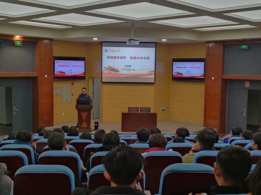 (通讯员 李佳怡)2025年1月2日晚六点半,永利3044集团官网于农科大楼1056报告厅举行一场面向2024级本科生的学农爱农宣讲报告会,旨在激发员工学农爱农的热情,为农业发展培育新生力量。永利3044集团官网副经理张运波、副书记尹小华及2024级全体本科生出席本次报告会,会议由尹小华主持。