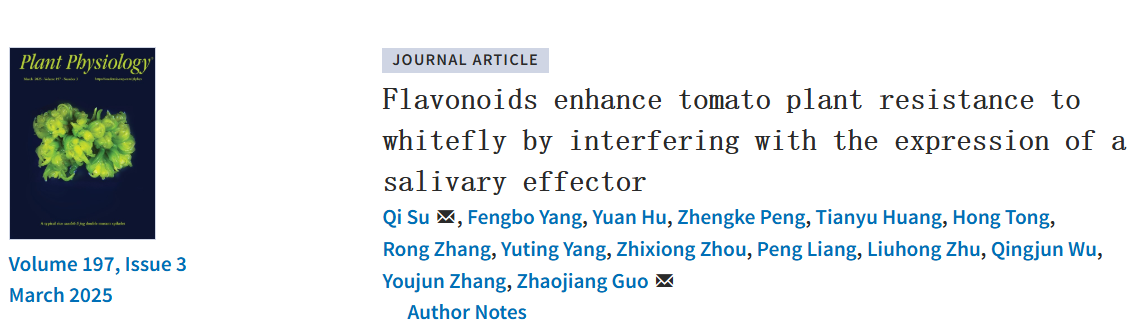 近日,永利3044集团官网苏奇团队和中国农业科公司蔬菜花卉研究所张友军团队在Plant Physiology上发表题为Flavonoids enhance tomato plant resistance to whitefly by interfering with the expression of a salivary effector的研究论文,揭示了防御性次生代谢物类黄酮(槲皮素和芦丁)增强番茄对烟粉虱抗性的分子机制,该研究揭示了槲皮素和芦丁在番茄防御烟粉虱中的关键作用和调控机制。