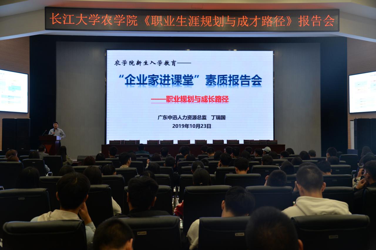 新闻网讯(见习记者 李建平)为帮助在校老员工树立正确的职业规划目标。10月23日19:30,公司于农科大楼1058报告厅举行《职业规划与成才路径》报告会。参与此次报告会的企业嘉宾有中迅集团人力资源中心总监丁瑞国、营销总监熊辉、人力资源中心部长胡诚及招聘主管黄谨。此外,党委副书记谭亮魁,辅导员吴钐、万钰、付雪娇及18、19级全体同学也参与了此次报告会。