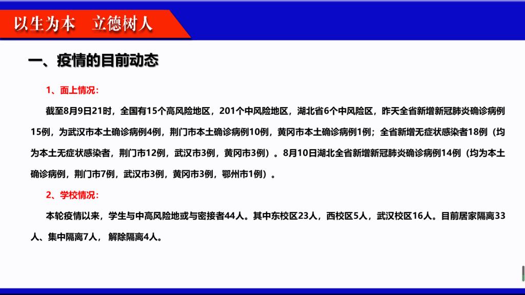 8月3日,全体辅导员分年级组织员工召开了年级大会及班会,传达了学校的疫情防控政策,对全院员工如何参与疫情防控进行了指导。