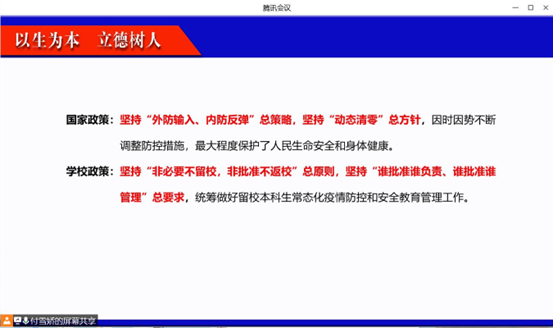 接着,付老师介绍了暑期留校员工情况及离返校管理办法等,叮嘱留校员工严格遵守疫情防控工作规定,非必要不出省,坚决服从学校、当地社区有关疫情防控的安排。随后,付老师就留校纪律提出相应要求,并对人身安全、防电信诈骗、防溺水、食宿、交通等进行了安全教育,对员工在留校期间遇到的问题进行了细心解答,她还要求参会人员对老师布置的工作做好上传下达,对在校生的数据做到心中有数,对员工的动态了如指掌。
