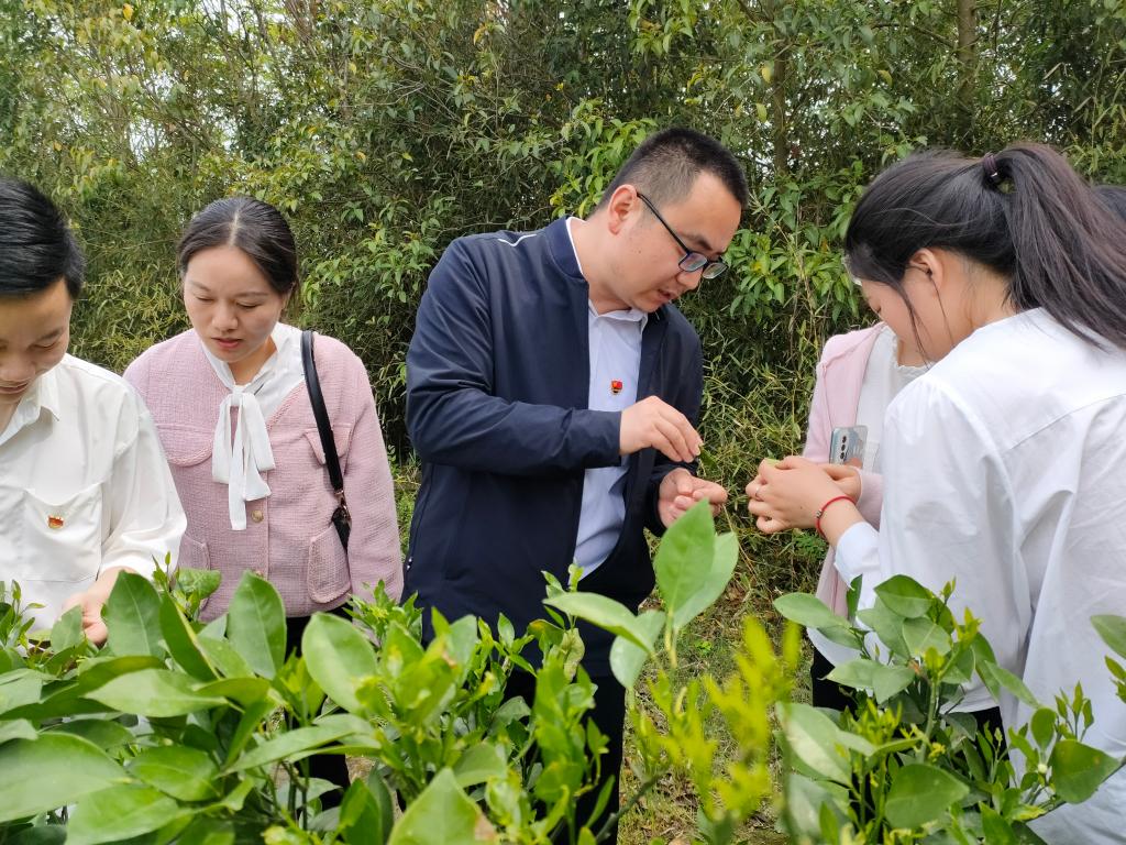 “专家们好,我家种了好几亩橙子,近几年,有一小部分橙子树出现烂叶枯枝,严重影响到产量,我该怎么办”,来自种植户喻叔叔说到。植保专业教师尹军良和张小磊两位老师,详细询问了发病过程、用药情况及土壤环境,并带领支部党员实地考察果园的情况。支部党员利用所学农业知识,运用实践经验,在尹老师和张老师的指导下,共同帮助农户们找到了问题根源,原因是往年结果太多,树势偏弱,冬天容易受到冻害,导致次年发芽推迟,建议采用稀果的方法来处理。