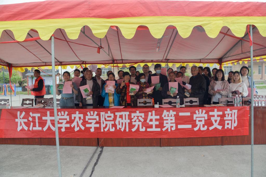 活动伊始,支部党员在新场村党员群众服务中心设立站点,积极了解新场村农户农业种植情况,通过与农户的深入交流,知晓当地的主要作物为水稻和油菜。为把农业知识传播千家万户,支部党员现场分发“水稻主要病虫害防控技术”宣传单,并为农户们解答在农业生产过程中遇到的问题。此外,现场还免费发放水稻、萝卜、黄瓜、空心菜、四季豆、豇豆等作物种子,活动现场氛围浓烈,农户们露出灿烂的笑容。