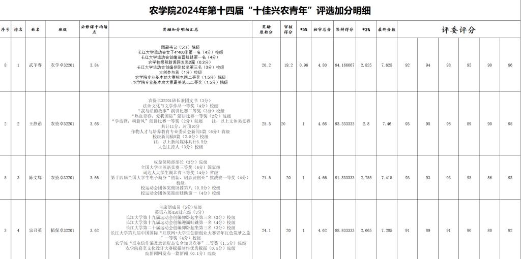为了全面提高农业人才的培养质量,加强新时代农业农村人才队伍建设,为乡村振兴提供科技支撑和人才支撑,为了树立先进典型,充分发挥典型的教育示范作用,有效激励全院员工勤奋学习,形成积极进取、学习先进、崇尚先进、争当先进的良好风气,促进员工全面发展和成长成才,经个人报名、资格审核、个人展示、面试答辩等程序,拟推荐武芊睿等10名同学为本届“十佳兴农青年”候选人。