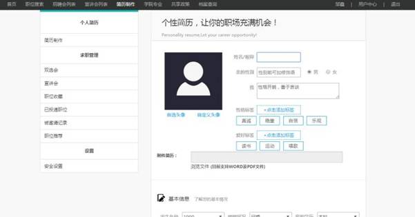 (1)基本信息:上传头像/姓名/性别/各类标签/自我介绍/集团/公司/专业/学历/联系方式/上传附件简历(2)职业意向:期望城市/期望薪资/期望行业(3)工作经历(4)教育经历(5)我的作品。