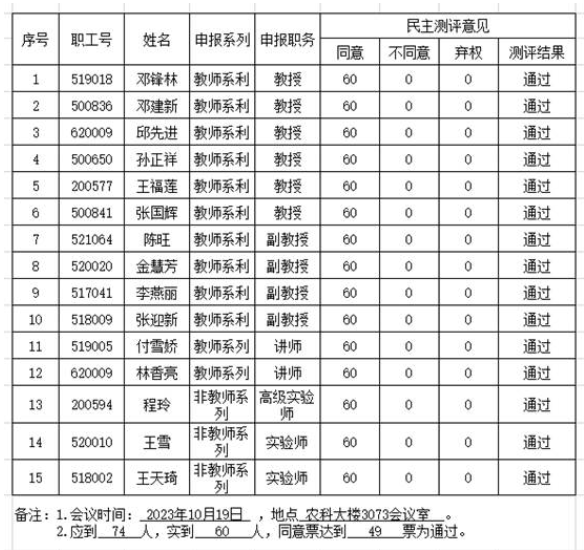 根据学校《关于开展2023年度专业技术职务评聘工作的通知》要求,公司于10月19日下午召开了2023年度专业技术职务评审民主测评会,经各申报人述职、参会高级职务的全体教师投票表决,现将测评结果公示如下: