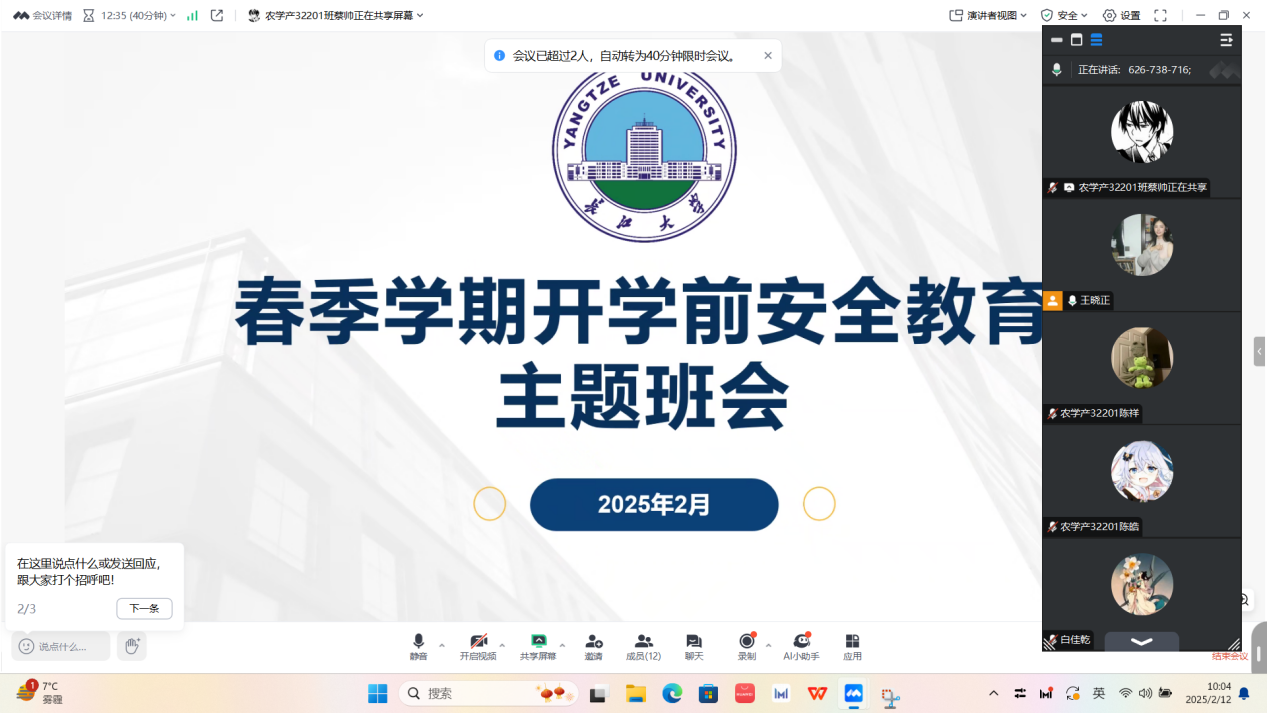 (通讯员 蔡帅 任俊杰) 为切实做好2025年春季学期员工返校安全工作,增强员工安全意识,筑牢校园安全防线,近日,永利3044集团官网以班级为单位,通过线上会议形式全覆盖组织召开“平安返校,安全启航”主题班会。全院各班级班主任全程参与,围绕返校流程、安全须知、健康防护等内容进行详细讲解,为员工顺利返校保驾护航。