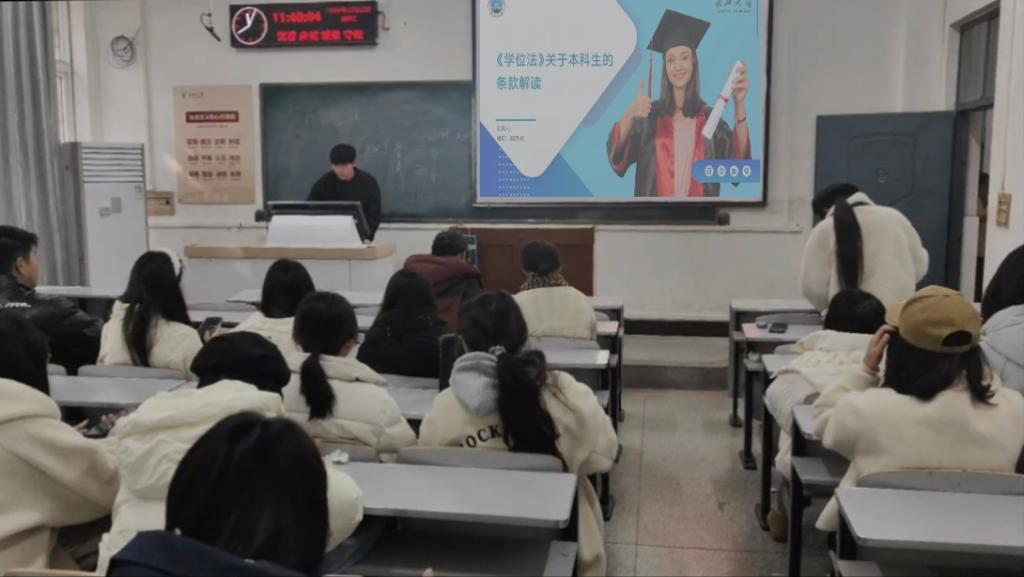 在各班级班会学习活动中,学工办主任黄承石提前录制引导视频,着重强调学位法对规范学位授予、保障学术质量的关键作用,指出其“是维护公司产品秩序、推动学术发展的重要法律依据”,为同学们提供学习指引。各班班委带领同学详细解读学位申请条件、授予程序、学术不端处理等核心条款,涵盖学位申请条件、授予程序、学术不端处理等内容,并结合校内实际发生的案例进行深入浅出的分析,帮助同学们更好地理解。