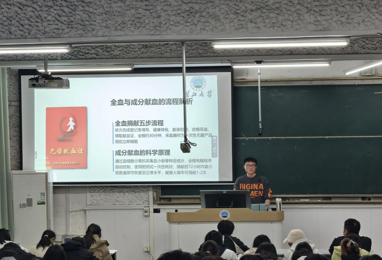 讲座现场,宣讲员景文卓以通俗易懂的语言,通过图文并茂的形式从无偿献血的意义、科学献血指南、无偿献血者权益和荆州血液现状等方面展开讲解,重点解答了“献血是否影响健康”“献血后如何科学恢复”“特殊人群献血注意事项”等员工关心的问题。破除了“献血伤身”的认知误区,让在场学子深刻认识到无偿献血是举手之劳的善举,更是青年应有的社会责任。