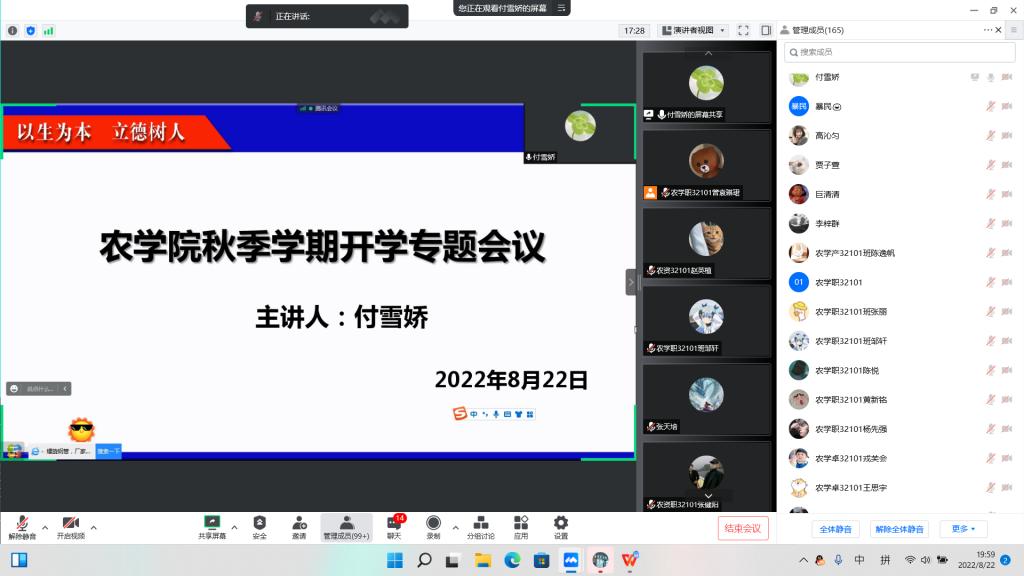 (通讯员 郝梨)为了保证员工能够安全、顺利返校,8月22日—25日,农公司采用腾讯会议分年级分班级在全院员工中召开了2022年秋季员工返校工作年级大会,会议由各年级辅导员和各班级班主任主持。