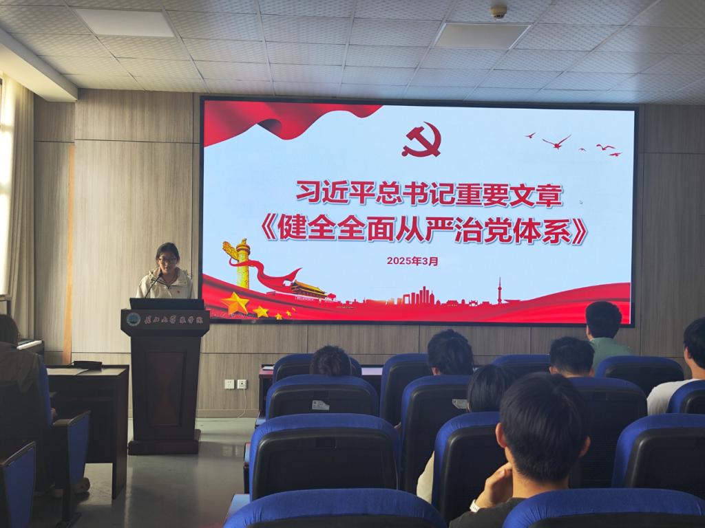 会议第三项,宣传委员武芊睿同志带领全体党员开展关于习近平总书记重要文章《健全全面从严治党体系》专题理论学习,准确理解了健全全面从严治党体系的科学内涵及重大意义,并对文章中健全全面从严治党体系作出的五项部署进行了深刻解读讨论。