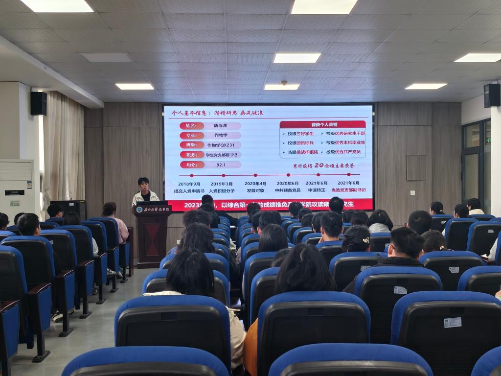 (通讯员 郑怡乐/文 郝梨/摄)党建领航研途路,先锋传薪启新程。为深入学习贯彻党的二十大精神,夯实研究生党支部战斗堡垒作用,11月12日中午,永利3044集团官网举行“一院一品”研究生党员学术经验分享活动。特邀公司3名研究生国家奖学金获得者:唐海洋、文泳、赵希梅作为主讲人为全体研究生党员和入党积极分子分享学术经验。