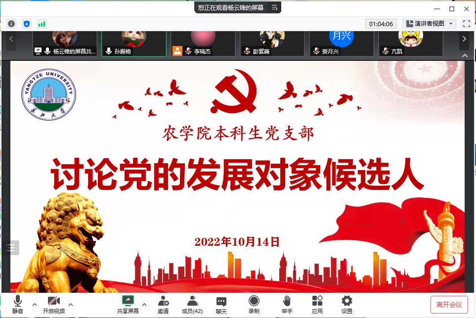 (通讯员 亢凯)为进一步加强农公司党员队伍建设,切实提高发展党员质量,10月14日上午9:00,公司本科生员工党支部在腾讯会议召开2022年下半年党的发展对象候选人讨论。活动由本科生员工党支部副书记唐海洋同志主持,本科生员工党支部书记杨云锋同志和全体本科生党员参加了讨论会。