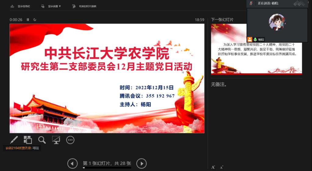 会议伊始,组织委员吴怡燃同志带领全体党员重温入党誓词。紧接着,杨阳同志对本月党费交纳情况进行说明。随后,由杨阳、刘曼莹、张浩然、贾艺泉和雷尧同志轮流诵读《中国共产党章程(修正案)》总纲相关内容,集体观看《二十大报告解读:科教兴国人才强国》和《二十大代表风采录——路丙辉:一路烛光》两个学习视频。接着,进入党课与集体学习党的创新理论环节,由曹佩娜、周璇同志分别讲授党课——《解读党的二十大报告主要精神》和微党课——《缅怀伟大的江泽民同志》;邓小倩同志带领学习《习近平谈治国理政》第四卷第六至第十部分;魏展鹏同志带领学习《习近平总书记主持召开中共中央政治局常务委员会 会议听取新冠肺炎疫情防控工作汇报 研究部署进一步优化防控工作》;刘至幸同志带领学习《中共永利3044集团官网委员会关于深入学习宣传贯彻党的二十大精神的通知》。通过此次理论学习,我们深刻认识到面对严峻的疫情形势,我们要当好自己健康的第一责任人,不恐慌不焦虑,以积极的心态配合疫情防控工作,坚决打赢疫情防控阻击战;同时认真研读政策,紧跟时代步伐,全国上下勠力同心,挺过艰难时刻,以实际行动贯彻落实党的二十大精神。