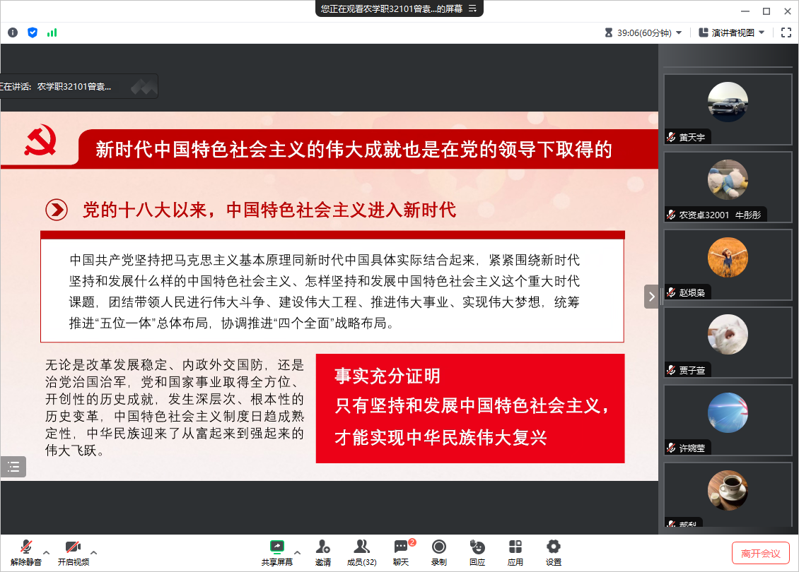 曾袁琳珺以坚持党的全面领导为题讲授微党课,一是中国共产党是中国现代化和民族复兴呼唤新的政治力量;二是中国共产党应运而生实现了中国社会的深刻变革,三是中国共产党领导中国特色社会主义发展了中国,四是新时代中国特色社会主义的伟大成就是在中国共产党的领导下取得的。