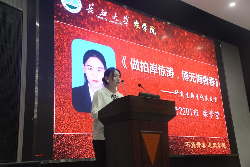 农资32201班王静茹和农研2201班柴梦莹分别作为本科生和研究生代表上台发言,表达了对永利3044集团官网师生的感谢和对新生活的憧憬。“中国人的饭碗要牢牢抓在自己手中”,王静茹鼓励同学们将青春奉献给祖国的土地,学农爱农。柴梦莹呼吁同学们“做拍案惊涛,博无悔青春”,从三个方面阐述她所理解的长江精神,希望同学们在研究生期间不负韶华。